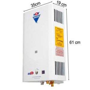 CALENTADOR DE PASO INSTANTANEO, GAS L.P. BAJA PRESION. 12 LITROS DE AGUA CALIENTE POR MINUTO. SOLO PRENDE CUANDO ABRE LA LLAVE DE AGUA CALIENTE , LOGRANDO UN GRAN AHORRO DE GAS. CAMARA DE COBRE ASEGURANDO UNA LARGA VIDA A SU CALENTADOR, NO TIENE DEPOSITO, PARA GAS L.P. MEDIDAS (ANCHO) 35 cm (ALTO) 61 cm (PROFUNDIDAD) 19 cm. MEDIDA DELA CONEXION DE ENTRADA 1/2″, MEDIDA DE LA CONEXION DE SALIDA 1/2″, MEDIDA DE LA CONEXION DE GAS 3/8″ FLARE. 2 AÑOS DE GARANTIA